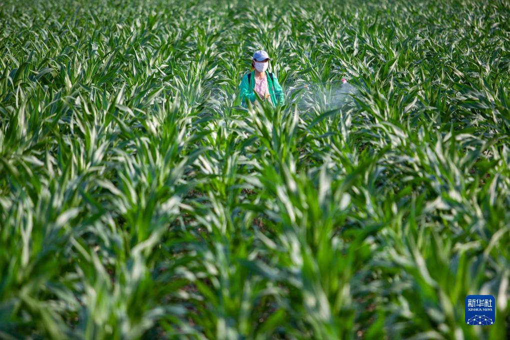 7月22日,在山東省淄博市高青縣黑裏寨鎮,農民為玉米進行植保作業。