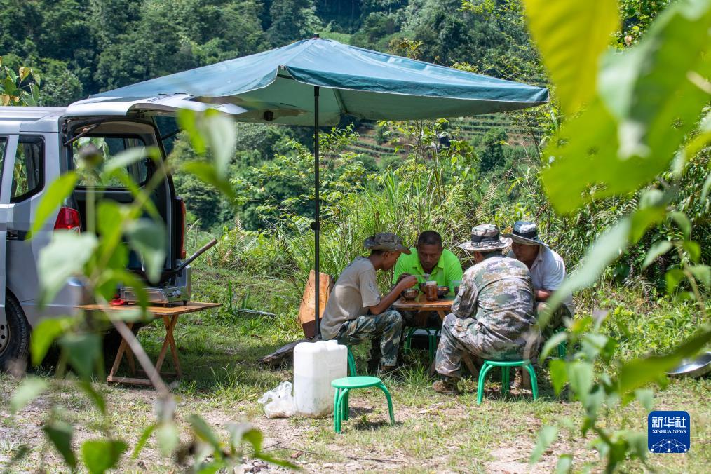 刁發興(左二)和監測隊隊員在“生活車”旁用餐(7月20日攝)。