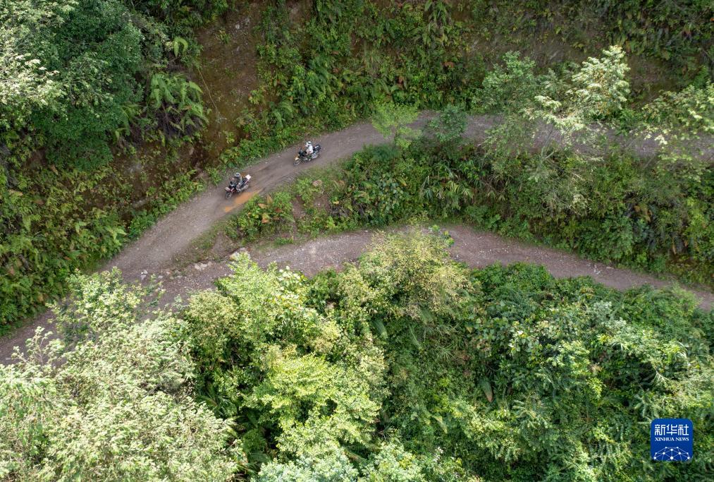 兩名監測隊隊員騎着摩托車去監測野象(7月20日攝,無人機照片)。