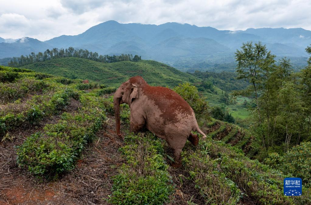 一頭亞洲象在雲南省江城縣一處茶園裏活動(7月19日攝,無人機照片)。