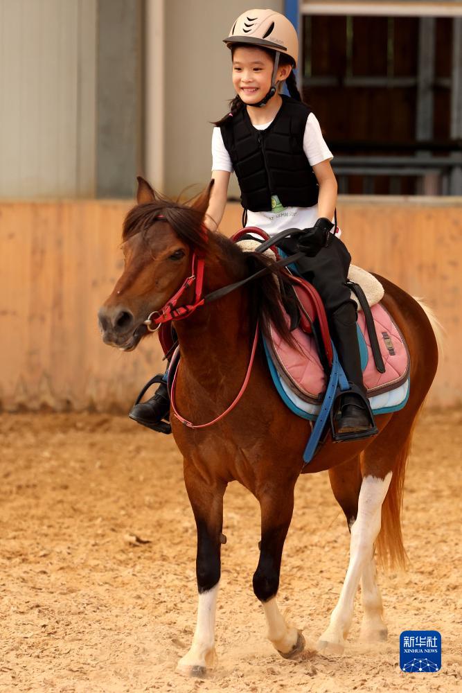 7月22日,在山東省棗莊市一家馬術俱樂部,小學生騎馬參加“盛裝舞步”比賽。