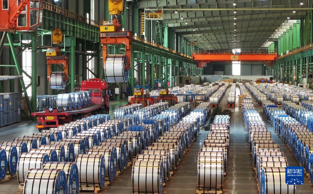 在首鋼京唐鋼鐵聯合有限責任公司鍍錫板事業部成品庫,吊裝設備將鍍錫板裝車(7月22日攝,無人機照片)。