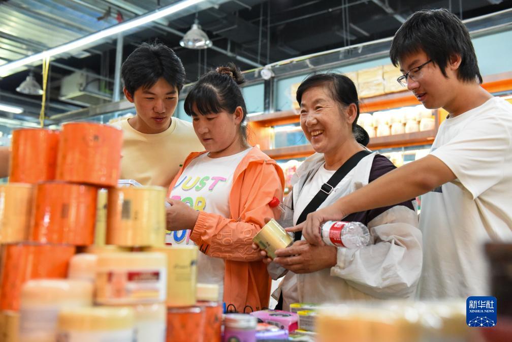 在新疆塔城巴克圖中哈邊民互市絲路文化商品城,游客在選購商品(7月22日攝)。