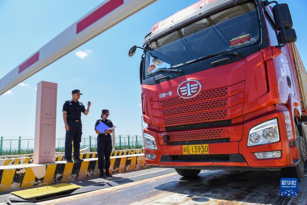 在新疆塔城巴克圖中哈邊民互市,塔城海關工作人員對準備離開監管區的車輛進行查驗(7月22日攝)。