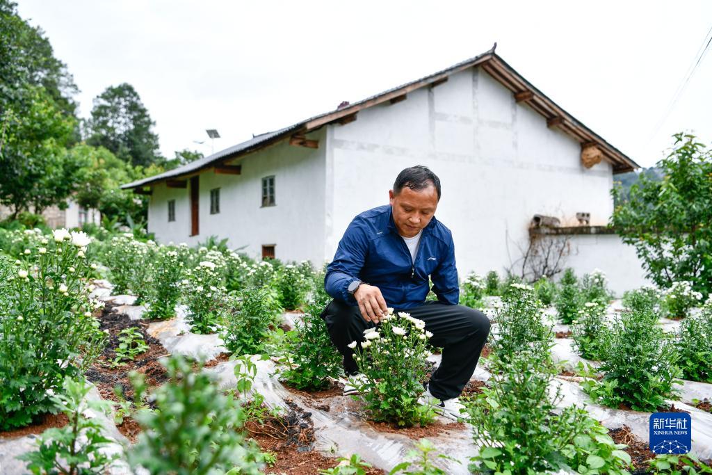 朱大清在地裏查看自己種植的藥用菊花(7月19日攝)。