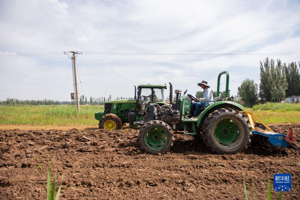 7月23日,在寧夏青銅峽市蔣南村,農民操作機械在田間作業。
