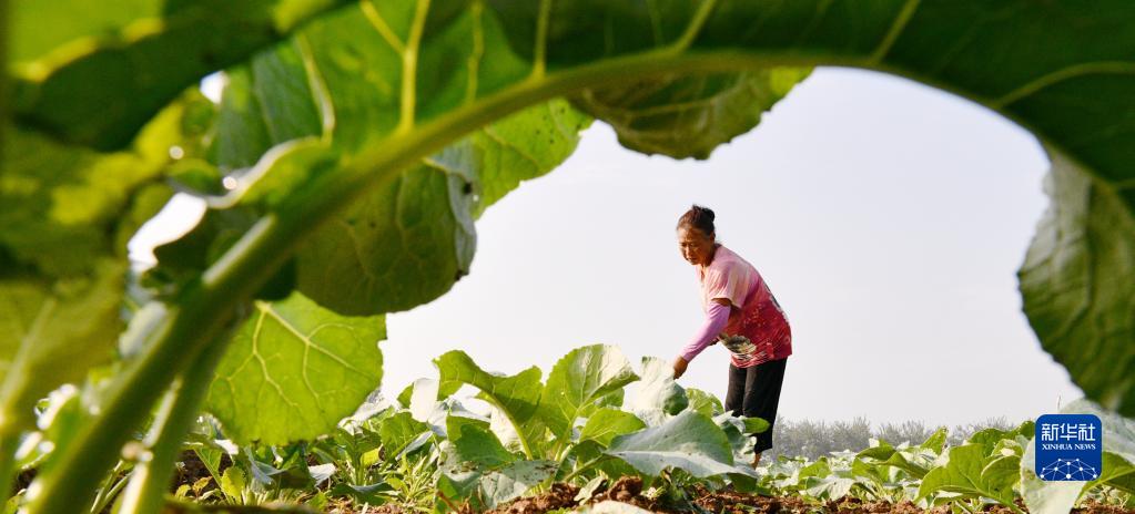 7月23日,在河北省石家莊市欒城區趙家莊村農田裏,菜農在管護菜花苗。