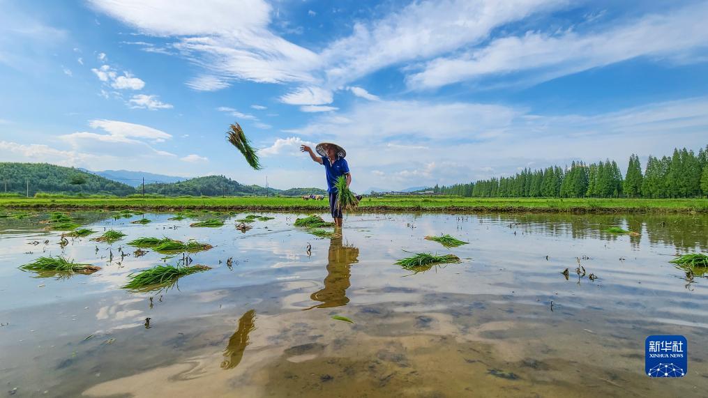 7月23日,在湖南省常寧市三角塘鎮長江村,村民在拋丟晚稻秧苗,準備蒔插。