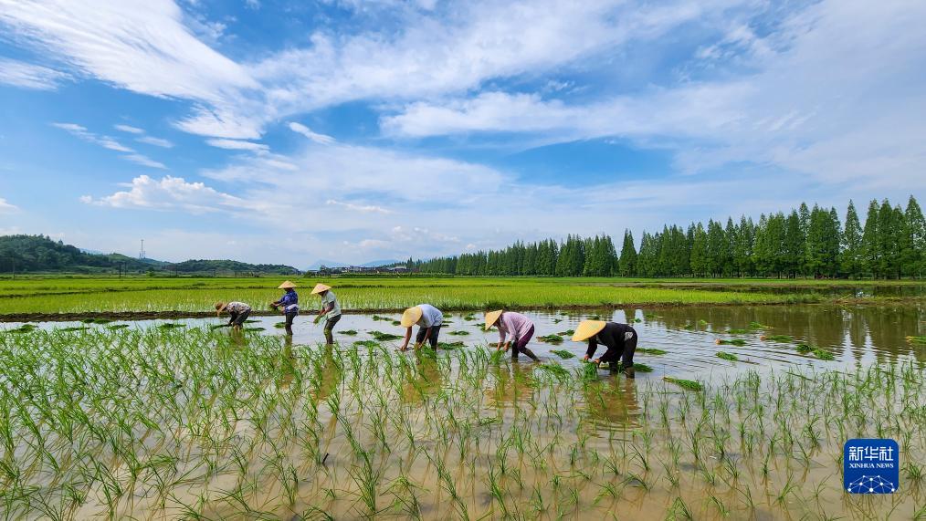 7月23日,在湖南省常寧市三角塘鎮長江村,村民在搶插晚稻。
