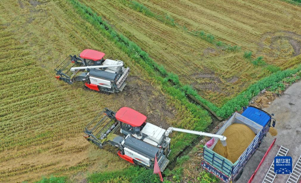 7月23日,浙江省台州市仙居縣白塔鎮,農民將收割的稻穀裝車(無人機照片)。