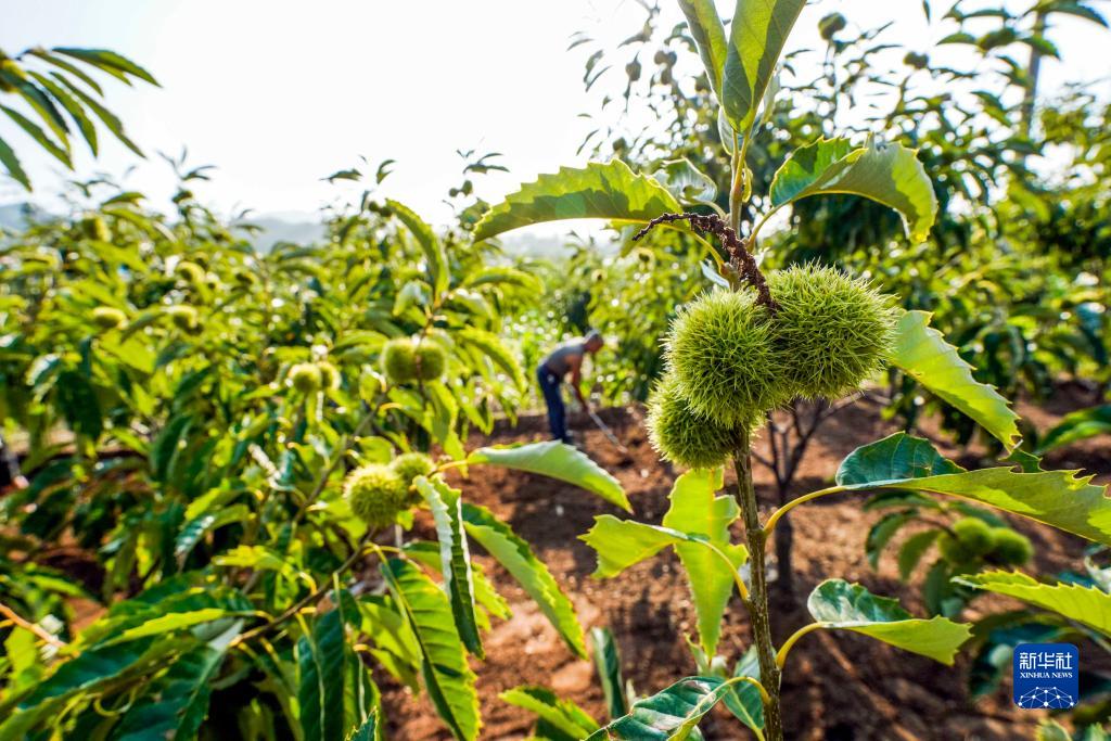 7月23日,河北省遵化市侯家寨鎮農民在栗樹果園整理樹下土地。