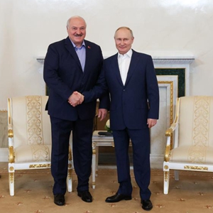7月23日,在俄羅斯聖彼得堡,俄羅斯總統普京(右)與白俄羅斯總統盧卡申科握手。