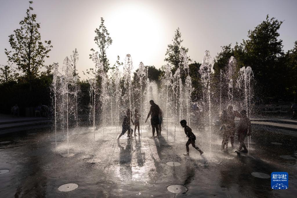 7月23日,兒童在希臘雅典一處噴泉玩水。