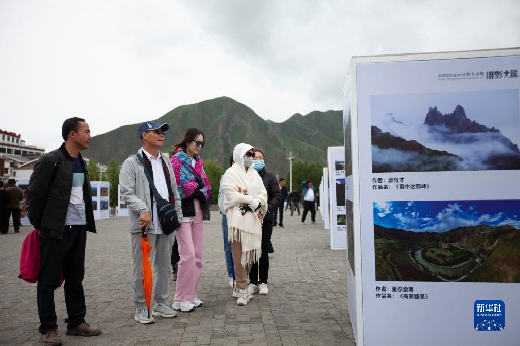 7月24日,人們在青海玉樹格薩爾廣場參觀2023首屆中國野生動物攝影大展。