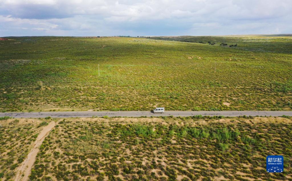 夏日時節,內蒙古自治區杭錦旗境內的穿沙公路綠意盎然,綠色沿着道路前行,並向兩旁的沙地鋪展,猶如一條條“綠色動脈”在庫布其沙漠中綿延。