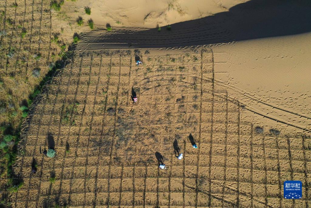 7月22日,工人在杭錦旗境內的S215線道路兩旁扎制草方格沙障(無人機照片)。