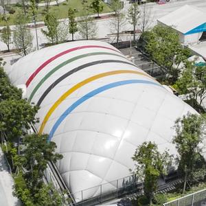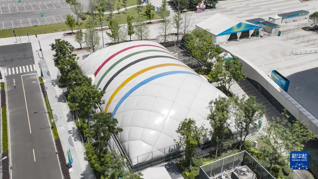 這是7月22日在成都高新體育中心多功能館外拍攝的臨時訓練氣膜館(無人機照片)。該臨時訓練氣膜館採用輕型裝配式氣膜結構,利用氣壓來支撐,無需任何梁、柱,可得到更大的完全凈空的建築空間,具有節約能源、減少水資源消耗、降低二氧化碳排放量、延長使用壽命、降低建築物運行成本、促進可持續發展等優點。