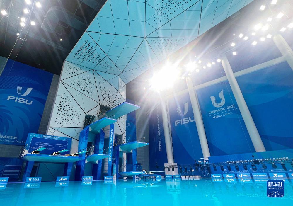 7月22日拍攝的簡陽文體中心游泳館跳水&,它是我國唯一一座多折面異型清水混凝土跳&,經久耐用且節約資源。簡陽文體中心游泳館是成都大運會跳水項目的比賽場館。