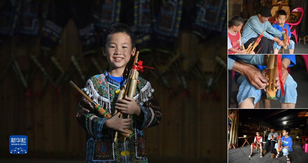 拼版照片:左圖為廣西融水苗族自治縣桿洞鄉黨鳩村9歲的小學生梁文雄(7月5日攝);右圖為梁文雄跟着爺爺學習吹奏蘆笙(照片均攝於7月6日)。梁文雄很喜歡吹蘆笙,每到假期,他都會跟爺爺、爸爸學習吹蘆笙。