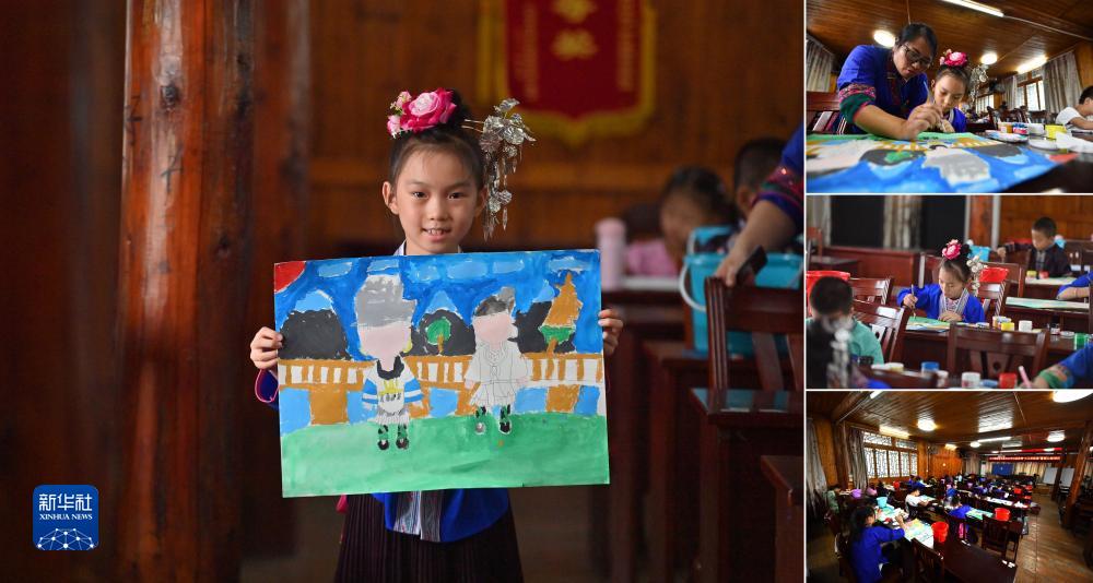 拼版照片:左圖為廣西三江侗族自治縣8歲的小學生楊莉娜;右圖為楊莉娜在縣文化館非遺公益培訓班上學習侗族農民畫(照片均攝於7月13日)。暑假期間,三江侗族自治縣文化館舉辦侗族農民畫公益培訓班,喜歡繪畫的楊莉娜報名參加,她希望能把家鄉的風雨橋、梯田、蘆笙、鼓樓都畫進自己的作品裏。