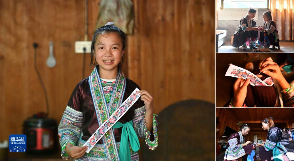 拼版照片:左圖為廣西融水苗族自治縣桿洞鄉堯告村10歲的小學生韋文慧;右圖為韋文慧跟着媽媽學習苗族刺繡(照片均攝於7月6日)。暑假期間,韋文慧經常跟媽媽學習苗族刺繡,她希望長大以後做漂亮的苗衣給媽媽穿。