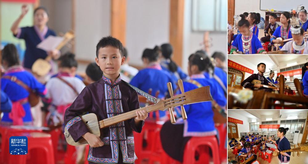 拼版照片:左圖為廣西三江侗族自治縣9歲的小學生潘文祥;右圖為潘文祥在縣文化館非遺公益培訓班上學習彈唱侗族琵琶歌(照片均攝於7月13日)。暑假期間,三江侗族自治縣文化館舉辦侗族琵琶歌公益培訓班,喜歡吹奏侗族樂器的潘文祥報名參加。