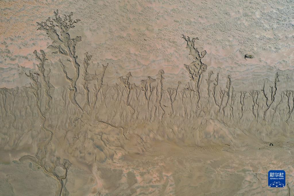 近日,隨着黃河調水調沙結束,黃河河南省開封市黑崗口險工段水位下降。河床被水流沖刷過後呈現出縱橫交錯的“脈絡”。
