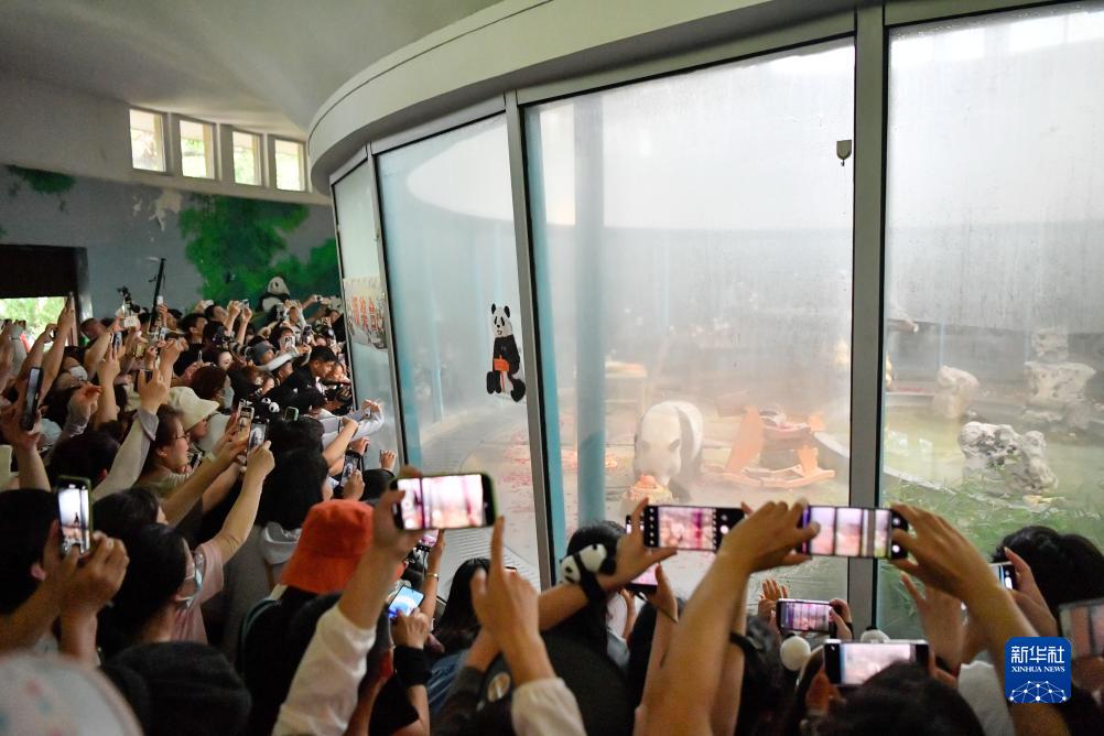 7月24日,市民游客來到天津動物園熊貓館為大熊貓“喜樂”慶生。