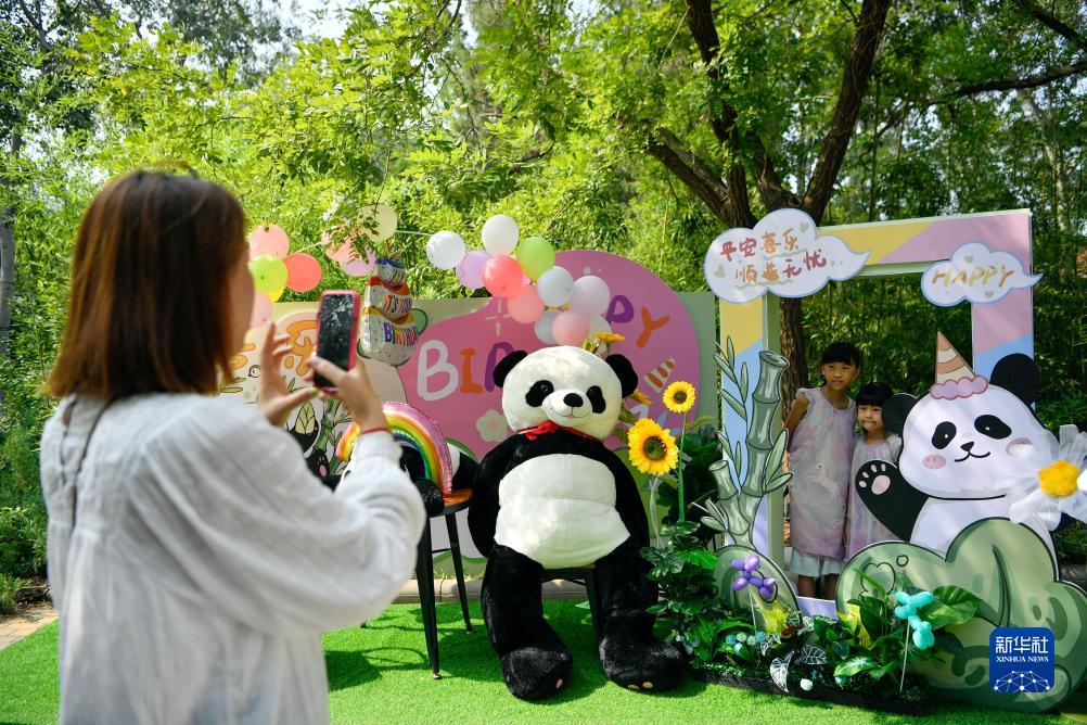 7月24日,在天津動物園熊貓館,市民游客與大熊貓“喜樂”生日祝福裝飾合影留念。