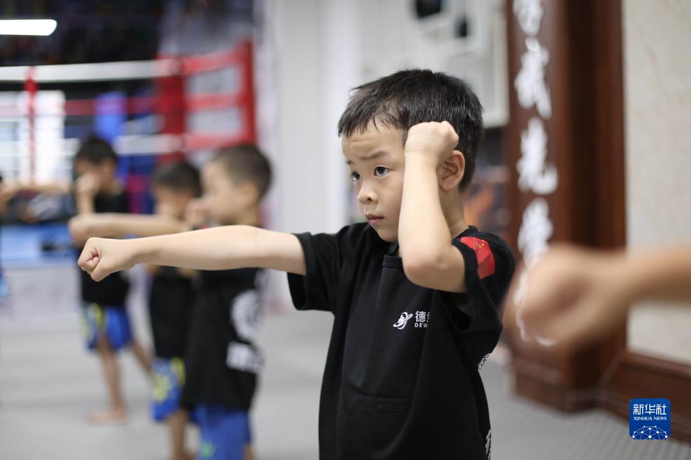 7月24日,在湖南省永州市道縣一家搏擊館,小朋友練習搏擊動作。