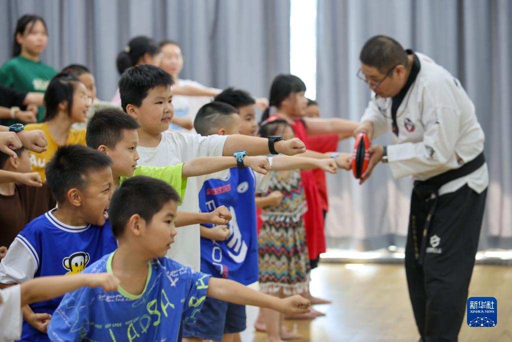 7月24日,在浙江省湖州市吳興區埭溪鎮總工會,小朋友學習武術。