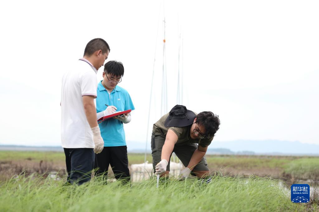7月9日,中國科學院洞庭湖濕地生態系統觀測研究站科研人員鄒業愛博士(左)和學生在湖南東洞庭湖國家級自然保護區採集苔草樣本。新華社記者 薛宇舸 攝