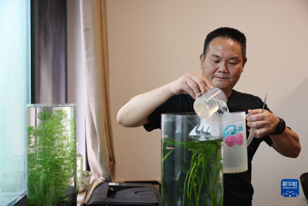7月8日,謝永宏在位於湖南省長沙市的中國科學院亞熱帶農業生態研究所的辦公室內修剪種養的沉水植物。新華社記者 金立旺 攝