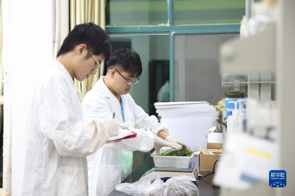 7月9日,科研人員在位於湖南省岳陽市的中國科學院洞庭湖濕地生態系統觀測研究站內將採集的苔草樣本稱重。新華社記者 薛宇舸 攝