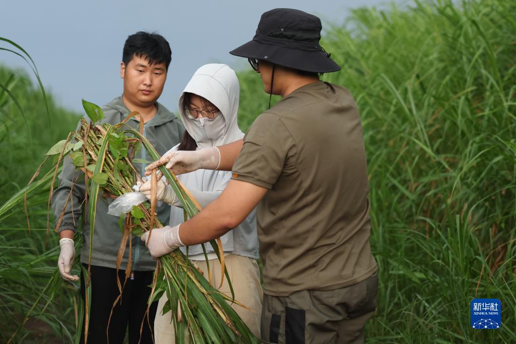 7月9日,中國科學院洞庭湖濕地生態系統觀測研究站科研人員在湖南東洞庭湖國家級自然保護區將採集的植物樣本捆好,以便帶回實驗室。新華社記者 薛宇舸 攝