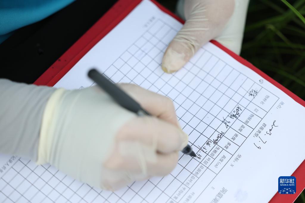 7月9日,中國科學院洞庭湖濕地生態系統觀測研究站科研人員在湖南東洞庭湖國家級自然保護區記錄採集苔草樣本的情況。新華社記者 薛宇舸 攝