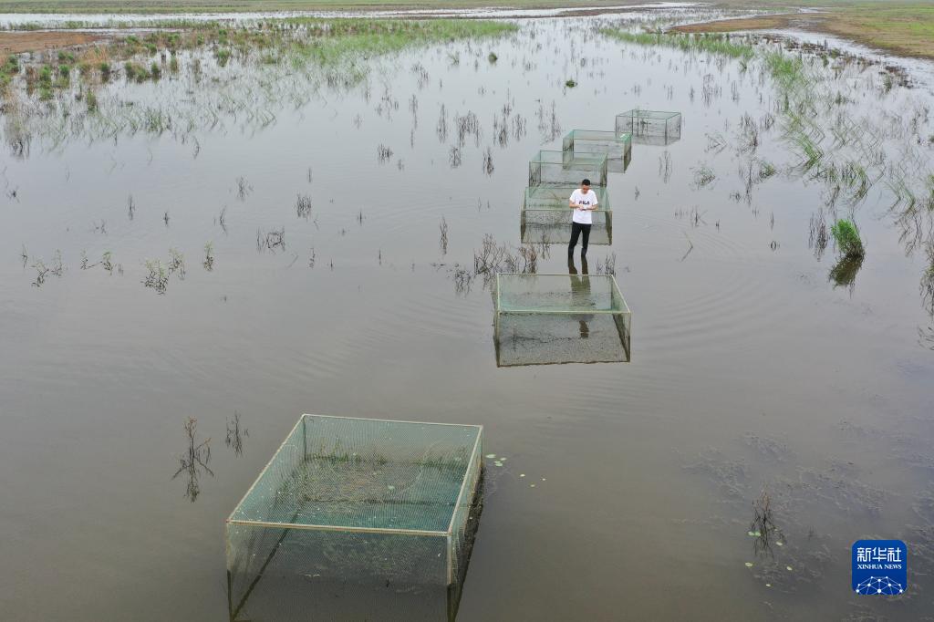 7月9日,中國科學院洞庭湖濕地生態系統觀測研究站科研人員巢傳鑫博士在湖南東洞庭湖國家級自然保護區查看種植的沉水植物生長情況(無人機照片)。新華社記者 薛宇舸 攝