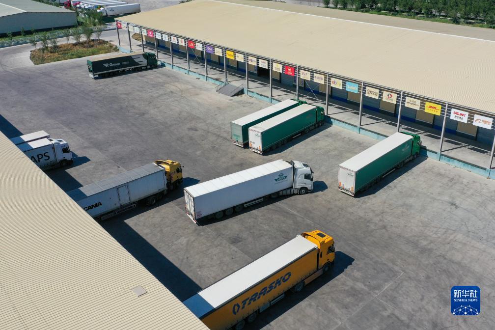 在新疆阿拉山口綜合保稅區內的跨境電子商務分揀清關中心,貨車等待裝車(7月24日攝,無人機照片)。