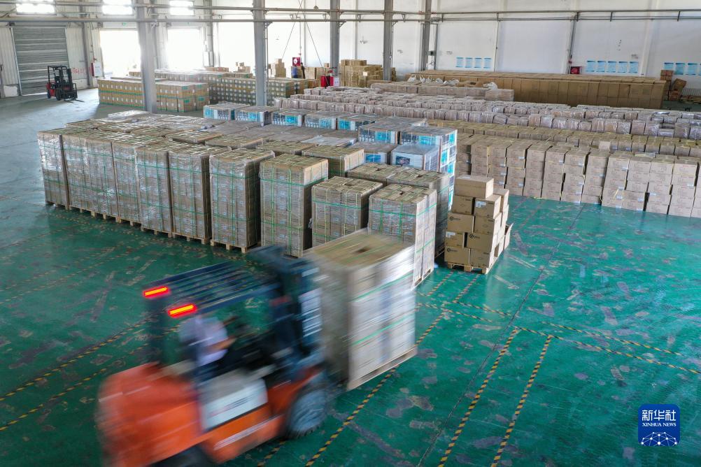 在新疆阿拉山口綜合保稅區內的跨境電子商務分揀清關中心,工作人員在監管倉庫轉運貨物(7月24日攝,無人機照片)。