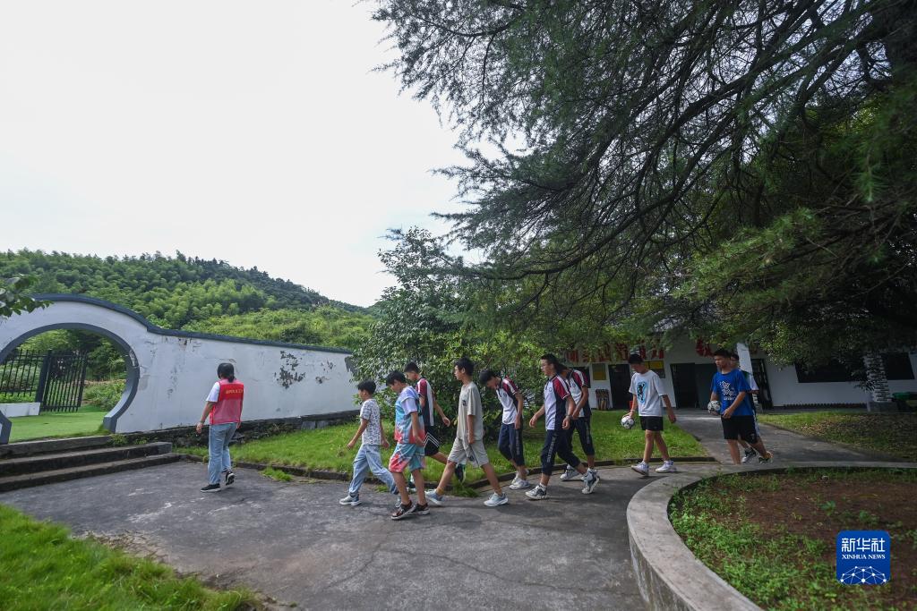 7月25日,在諸暨市馬劍鎮上和村的侯門山鄉村圖書館,暑托班的孩子們在志願者老師的帶領下參加戶外活動。