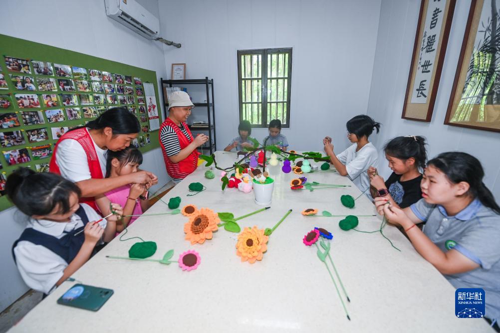7月25日,在諸暨市馬劍鎮上和村的侯門山鄉村圖書館,暑托班的孩子們在志願者老師的帶領下學習用毛線編織鉤織花。