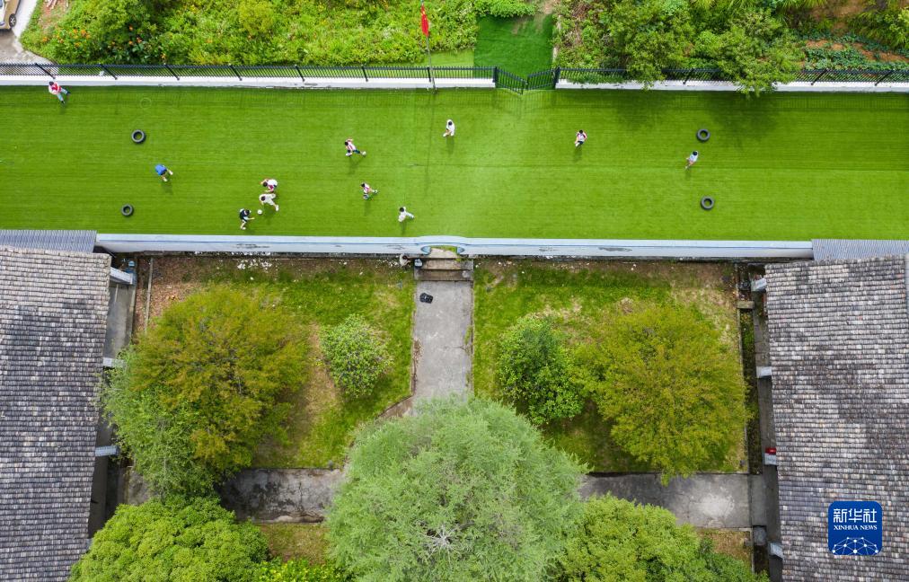 7月25日,在諸暨市馬劍鎮上和村的侯門山鄉村圖書館,暑托班的孩子們在參加體育比賽(無人機照片)。