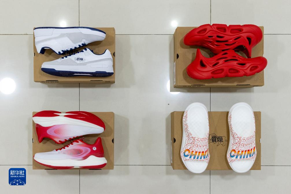 這是7月24日拍攝的第31屆世界大學生夏季運動會中國代表團成員配發裝備中的不同功能的鞋。