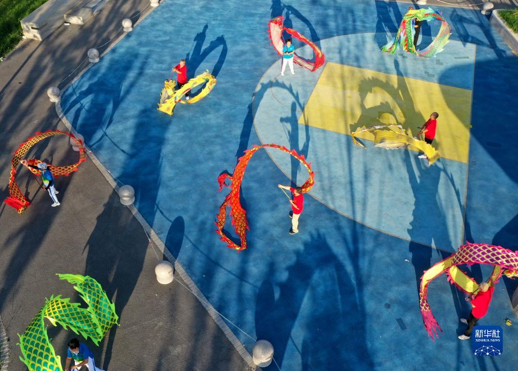 7月25日,市民在白溝新城一處“口袋公園”舞龍(無人機照片)。
