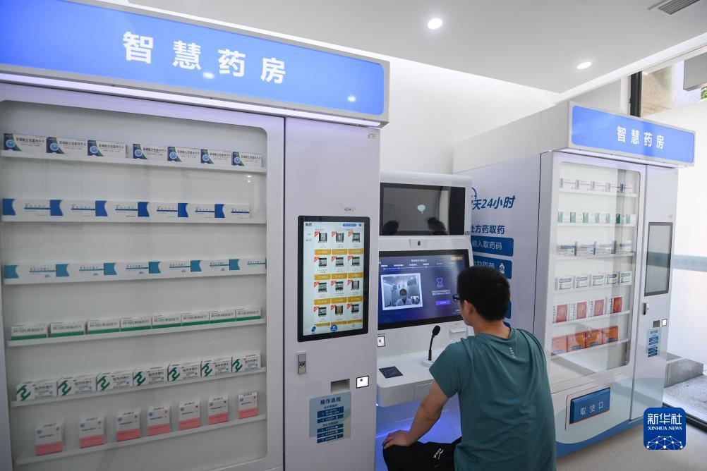7月25日,居民在諸暨市浣東街道東盛社區衞生服務站的智慧藥房內進行遠程問診,問診完畢後可以開具處方並配好日常用藥。