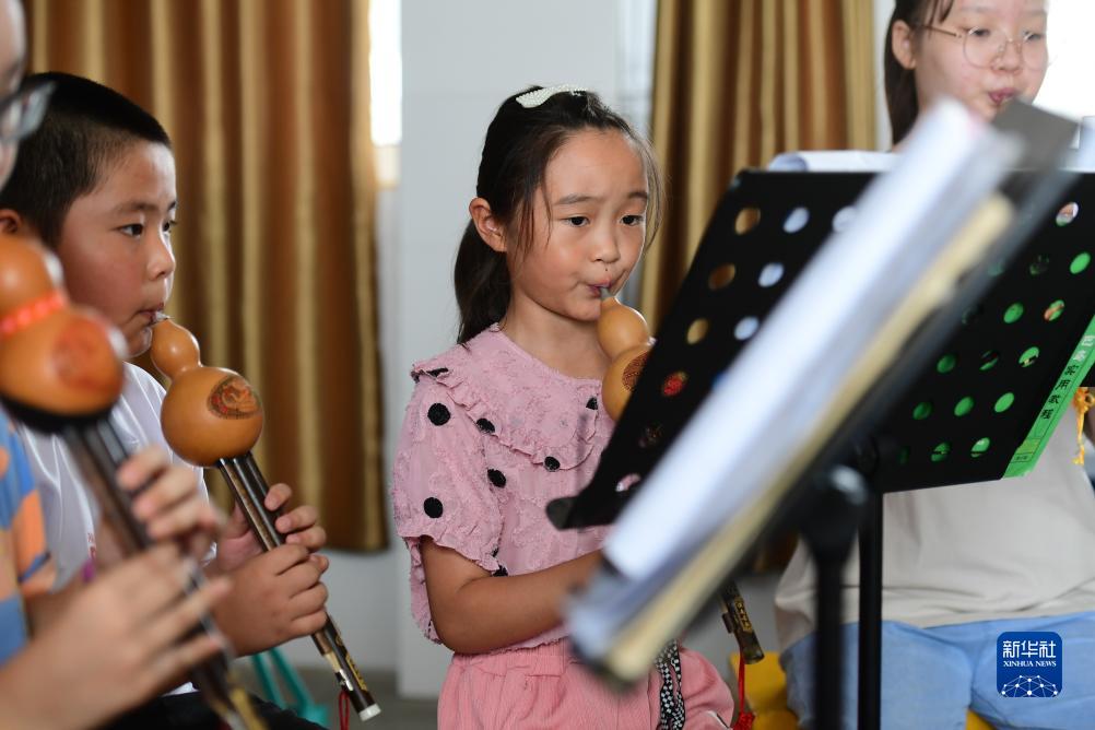 7月25日,孩子們在合肥市肥西縣紫蓬鎮中心學校少年宮學習吹奏葫蘆絲。