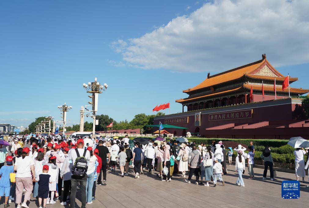 人們在天安門城樓前參觀游覽(7月9日攝)。