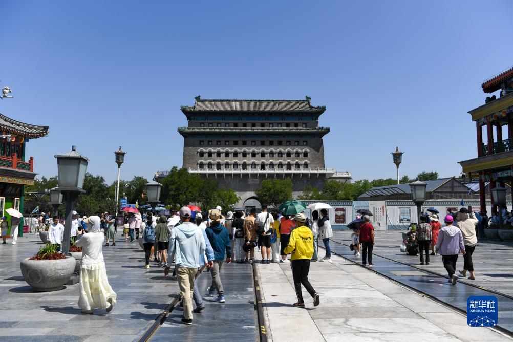 游客在正陽門箭樓前的前門大街參觀游覽(7月6日攝)。正陽門是中國明、清兩代王朝都城的正南門,坐落在老北京城的南北中軸線上,俗稱前門。1988年,正陽門城樓和箭樓被國務院批准列入第三批全國重點文物保護單位。