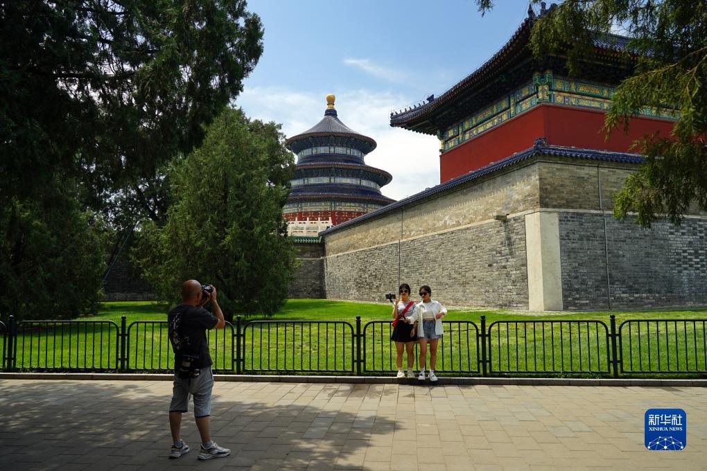 游客在天壇祈年殿外打卡拍照(7月10日攝)。天壇始建於明永樂十八年(1420年),是世界上現存規模最大、保存最完整的古代祭天建築群,1998年被列入世界文化遺産名錄。