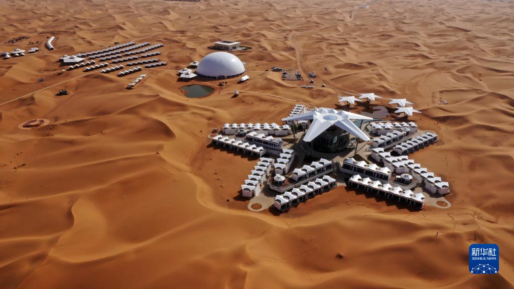 7月20日在中衛市沙坡頭景區騰格裏沙漠拍攝的星星酒店(無人機照片)。